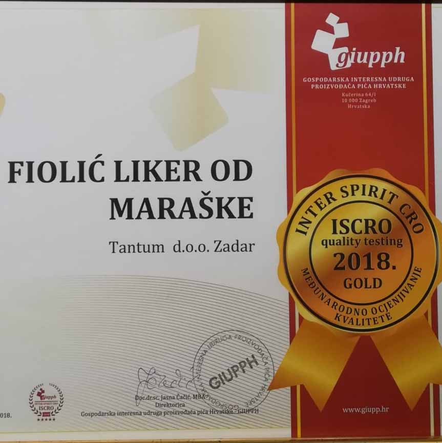 Liker od Maraške Fiolić - Maraška je stara hrvatska autohtona sorta ili podvrsta višnje najviše rasprostranjena u Ravnim kotarima (Škabrnja, Prkos, Zemunik Donji).Ima snažnu aromu i odličnu kakvoću plodova zbog svoje visoke koncentracije suhe tvari.Upravo zbog toga je obožavamo u likerskoj proizvodnji, ali i zbog niza drugih sastojaka koji utječu na organileptiku proizvoda. Posebnom ljubavi, velikim radom i drukčijim pristupom proizvodnji (tradicija i "hand made"), proizveden je LIKER OD MARAŠKE "FIOLIĆ" u ZADRU. Višestruko je nagrađivan za izvrsnost kakvoće proizvoda. Liker je prekrasnih organoleptičkih svojstava, ugodne ravnoteže alkohola, šećera i kiselina.